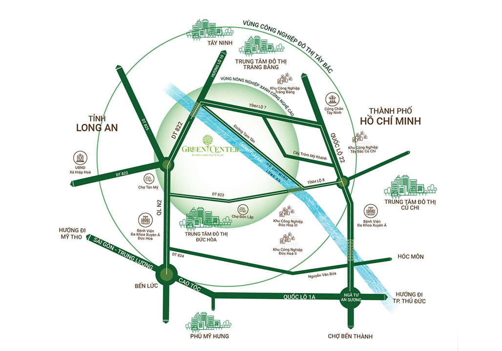 Tọa lạc tại vị trí tâm điểm kết nối “tam giác vàng”, là điểm giao trung tâm phát triển của ba đô thị hạt nhân Đức Hòa – Củ Chi – Trảng Bàng. Green Center Long An nằm trong trục động lực phát triển kinh tế đang được TP HCM quy hoạch và phát triển. Vị trí liền kề các khu công nghiệp trọng điểm như KCN Tây Bắc Củ Chi, KCN Trảng Bàng, KCN Tân Phú Trung, KCN Đức Hòa và các khu nông nghiệp xanh, công nghệ cao hiện đại chỉ cách Sài Gòn 30 phút di chuyển.