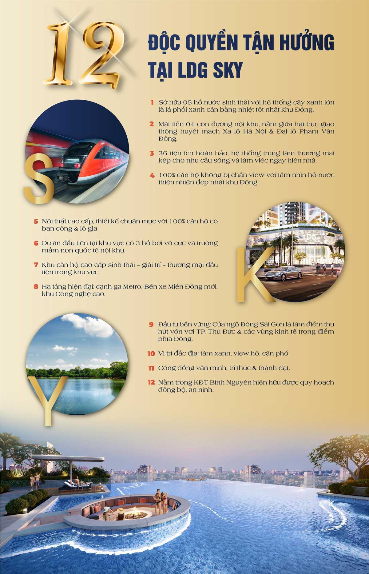 Bên cạnh đó còn có nhiều tiện ích nổi bật khác như Núi Châu Thới, Du lịch sinh thái Thủy Châu, Khu du lịch văn hóa Suối Tiên, Cù Lao Tân Vạn, Ga Sóng Thần… Tất cả những điều này khiến cho căn hộ LDG Sky trở thành một trong những lựa chọn hoàn hảo cho cư dân tìm kiếm một không gian sống tiện nghi và hiện đại.