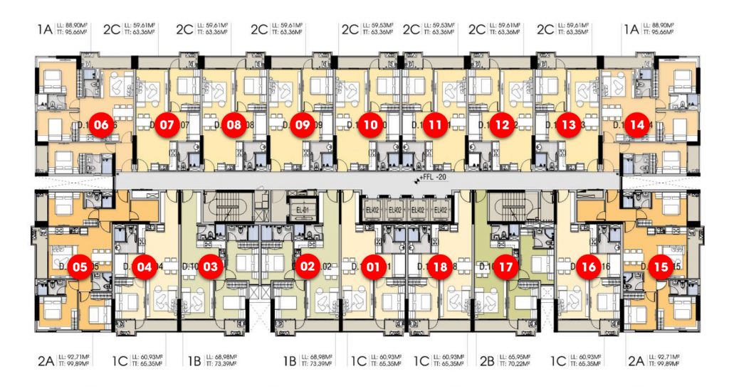 | Loại căn | Số căn/tầng | Tổng số căn | Diện tích nhỏ nhất | Diện tích lớn nhất |
