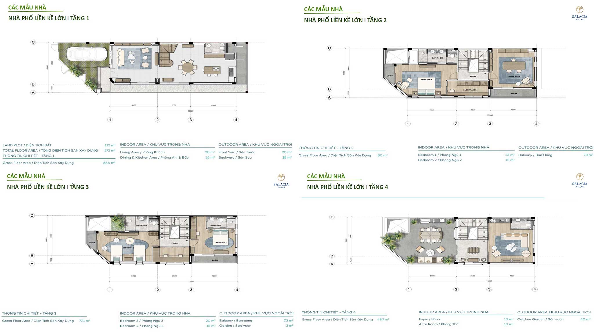 Thiết kế: 4 tầng, tổng diện tích sàn ~272 – 298 m².